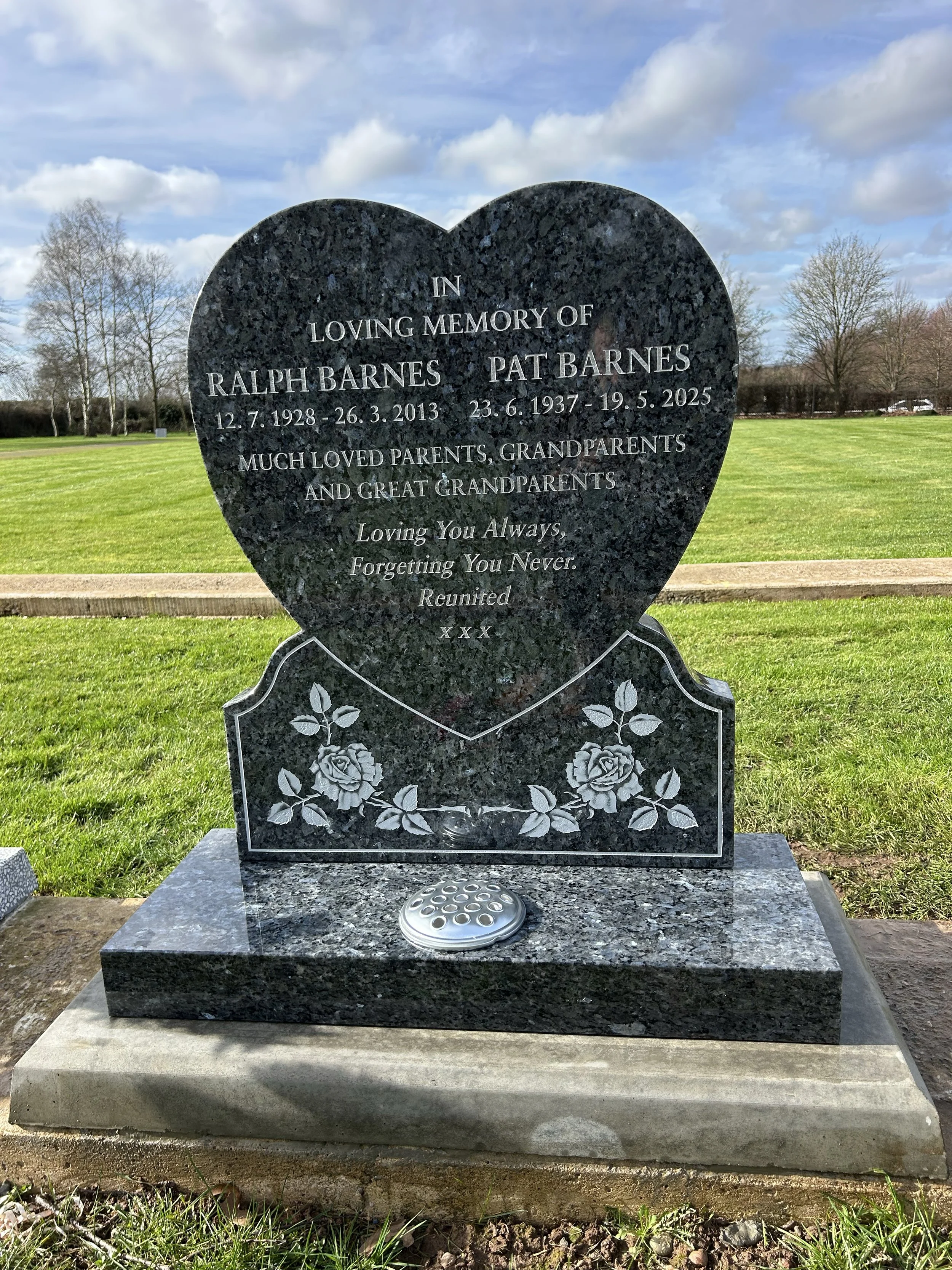 ‘We had a really good experience at Dobson’s when looking for a headstone for my parents. Steven was incredibly helpful, showing us the different stones and advising on which coloured lettering worked best on each one. We really wanted a heart memorial, and the end result was just beautiful and felt very personal to my parents. I would definitely use Dobson’s again and would highly recommend them to family and friends. Thank you so much, and keep up the great work.’